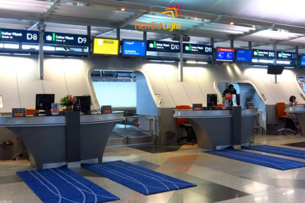 - Khu vực check-in: Hiển thị thông tin chuyến bay, nhắc nhở hành lý, thông báo khẩn.