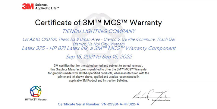 Tiến Dư Light công ty đầu tiên tại Việt Nam nhận chứng nhận Bảo hành 3M ™ MCS ™. Công ty 3M đã xây dựng dòng sản phẩm đồ họa tiên tiến nhất thế giới, nhưng 3M không dừng lại ở đó. Công ty 3M đưa các sản phẩm của mình vào thử nghiệm và thiết kế các sản phẩm bền bỉ và sáng tạo nhất cho doanh nghiệp.